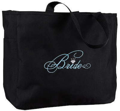 HBH™ Bride diamond tote bag is finished with inner pockets and "bride" embroidered in aqua thread on the front embellished with a diamond accent in silver thread. Bag has a dimension of 14" x 12" x 6 1/4".