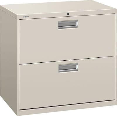 HON Brigade 600 Series Lateral file cabinet in light gray color is constructed from 30 percent post consumer materials. Lateral file cabinet measuring 28 1/2" x 30" x 19 1/4" features two drawers for storing the files up to 2.41 cu. ft.
