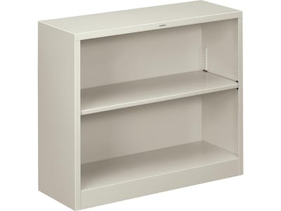 Provide organized, durable storage for office files with this light gray two-shelf metal bookcase. It has an adjustable upper shelf to fit different items, and its straight sides and back allow for flush placement alongside file cabinets and other storage furniture. This 34.5-inch HON Brigade metal bookcase is fully assembled for easy installation.