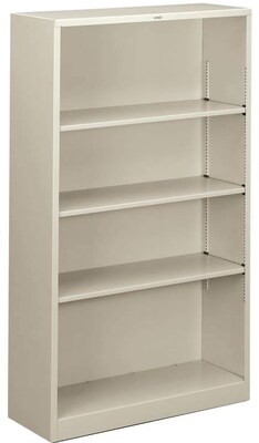 HON Brigade Metal bookcase in gray color measuring 59" x 34 1/2" x 12 5/8" has a baked-enamel finish to resist mar and has four shelves to store books, binders and office supplies.