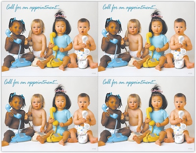 Attention-getting postcard captures your patients attention. The back of the postcard is blank so you can add a personalized message, using your own Laser Printer. Uncoated stock, perforated sheets. Four cards to an 8-1/2" x 11" sheet. 100 cards. Detached size: 4-1/4" x 5-1/2".