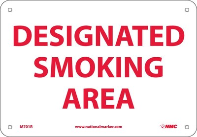 National Marker "Designated Smoking Area" Safety sign measures 7" x 10" and is made rigid plastic material for added durability.