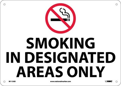 National Marker "Smoking In Designated Areas Only" Safety sign with graphic measures 10" x 14" and is made aluminum material for added durability.
