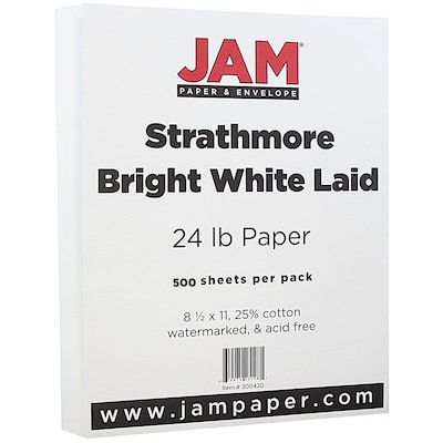 JAM Paper® Strathmore paper comes with ream of 500 sheets in bright white laid color which is made out of 25% cotton are perfect for any invites and available in 24 lbs paper and 80lb cover.