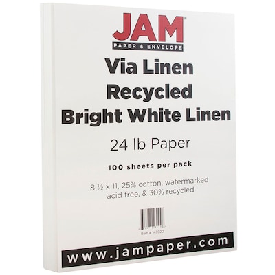 JAM Paper® Strathmore paper in bright white linen color is made from crisp and conservative 30% recycled papers. Paper has dimension of 8 1/2" x 11".
