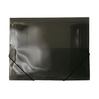 JAM Paper® Smoke Gray Letter Booklet Action Case/Plastic Portfolio measures 9 1/2 x 12 3/8 inches in size and features a dark, classy and professional gray color. This portfolio is sold individually and is made out of protective, durable plastic. With a single compartment on the inside, this portfolio is ideal for storing, carrying, and organizing standard letter sized documents. It has a straight flap cover that flips backwards to open the unit. There are two dark grey elastic strings attached to the back of the case that wrap around the two bottom corners in the front to keep it closed. Use this versatile portfolio in your office or work space.