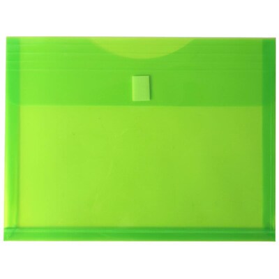 JAM Paper® Lime Green Letter Booklet Plastic Expansion Envelopes with certified Hook & Loop closure is 9.75 x 13 inches in size with a 1-inch expansion. In this pack of 12, each envelope has a certified Hook & Loop closure for tight closing and easy opening. Their size makes them perfect for standard sized documents and small office supplies such as pens, markers, paperclips, scissors, and more. With their zesty lime color they, are sure to bring some energetic brightness to any workspace! Their durable plastic material will protect your documents from bending, tearing, stains, and other damage. Use them in the office to easily keep your documents in drawers and on shelves. Use them to transport documents; they effortlessly fit into backpacks and briefcases!