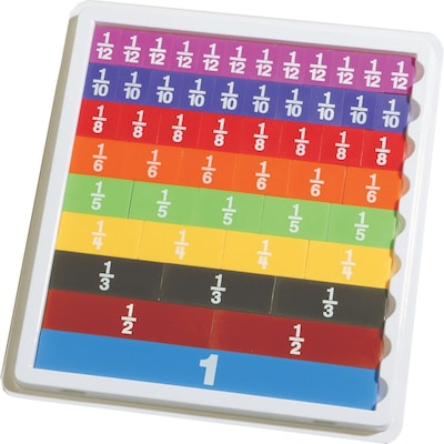 - Color-coded, proportional, plastic pieces represent a whole, halves, thirds, fourths, fifths, sixths, eighths, tenths and twelfths