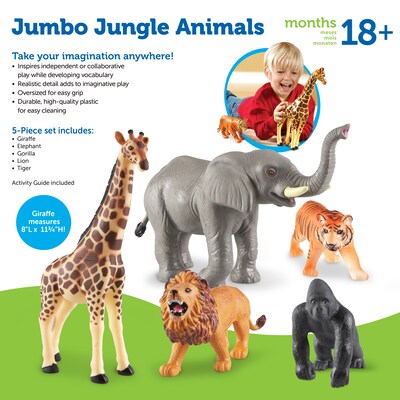 Learning Resources® Jumbo jungle animals include 5 popular animals lion, tiger, gorilla, elephant, giraffe and comes with carrying handle in a box. Animals are made of durable plastic and improves oral language skills through imaginative play.