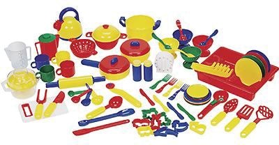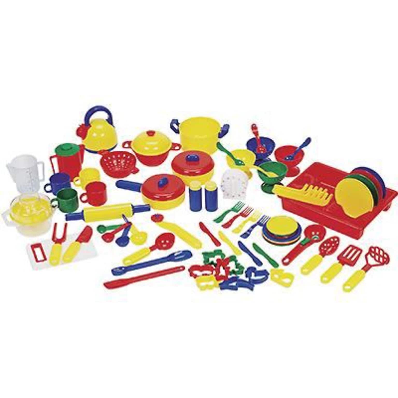 - Students will love to set up their own kitchen with this super-sized assortment featuring colorful pots, pans, cups, bowls, dishes, utensils, a tea pot, a strainer and a pitcher