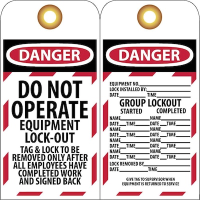 National Marker " Danger Do Not Operate Equipment Lock-Out..." Lockout tag measures 6" x 3" and is made unrippable vinyl material for added durability.