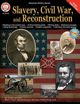 Mark Twain "Slavery, Civil War and Reconstruction" Resource book is ideal for grades 5 - 12 and features critical thinking as well as writing activities. Resource book with 128 pages includes topics such as Lincoln's presidency, Dred Scott and more.