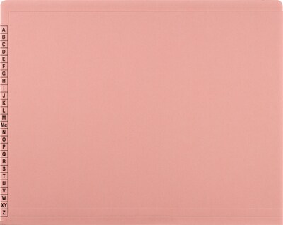Alpha/color coding system is simple to set up. It utilizes ten colors to make filing and retrieval simple, fast and eliminates misfiles. High-quality folders are constructed of 11-pt. pulp dyed colored stock. They are reinforced across the top and right hand tab. Folders have 8 scored tick marks on end tab.
