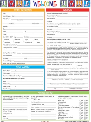 Combines thorough patient registration with specialized podiatric health history in a colorful, user-friendly format