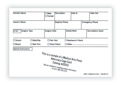 Includes check off boxes for a wide variety of services that may be needed, including grooming, heartworm and FeLV test. Also includes space to note dental work needed and vaccinations given. 110-lb. card stock. 250 per package. Size: 4x6".