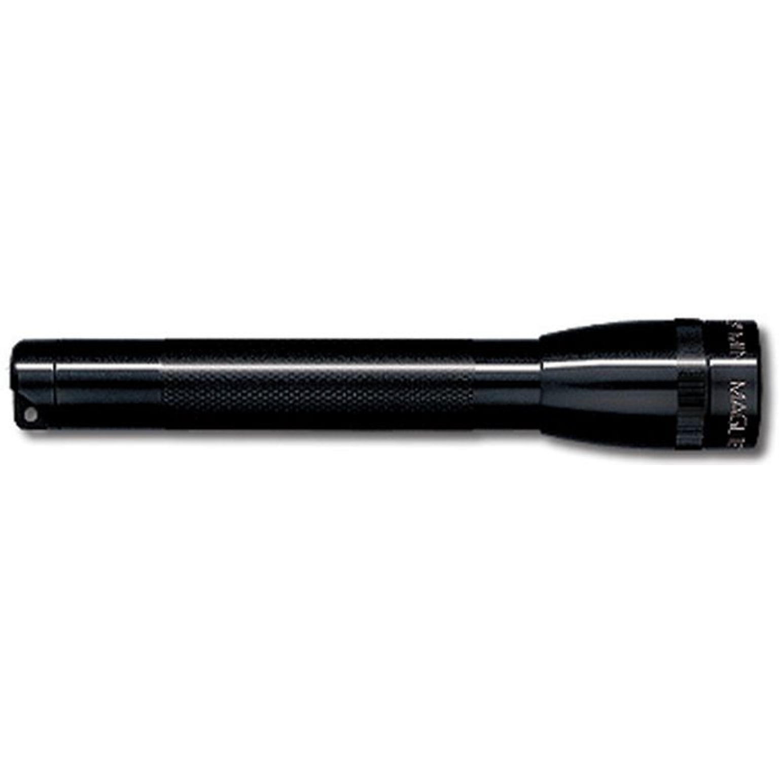 Mini Maglite® Flashlight in black color includes incandescent bulb that offers beam distance up to 96 m and has aluminum construction. Flashlight with pocket clip/lanyard wrist strap/lenses/holder requires 2 AA alkaline 3 VDC batteries to operate.