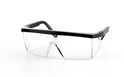Mutual Industries Clear marlin safety glass with black frame has plastic wide-angle brow plate for overhead protection. 1 oz safety glass meets all applicable ANSI standards and sold as 12 per pack.