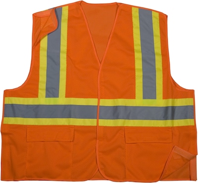 Mutual Industries MiViz XL orange ANSI class 2 mesh tearaway vest with pockets is made of 3.4 oz high visible lime knit polyester mesh for comfort and features 4" lime/silver/lime reflective tape.
