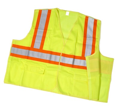 Mutual Industries MiViz Medium lime ANSI class 2 solid tearaway vest with pockets is made of 3.4 oz durable, knit polyester mesh for comfort and features 4" orange/silver/orange reflective tape.
