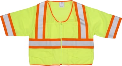 Mutual Industries MiViz 2XL lime ANSI class 3 mesh vest features zipper front closure and 2 large pouch pockets for total comfort. Mesh vest keeps user visible in dark with its 4" orange/silver/orange reflective tape on front and back.