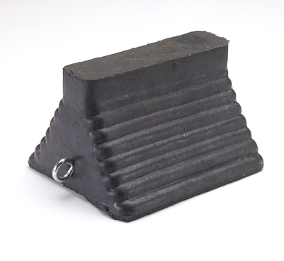 Mutual Industries Black Molded wheel chock with chain measuring 6" x 8" x 9" has fiber reinforced rubber construction that is ideal for tractor trailers and other heavy equipment.