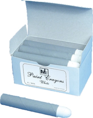 Mutual Industries White paint crayon is a solid paint in crayon form that marks on any surface like rough, oily, wet, hot or cold and is sold as 12 per box.