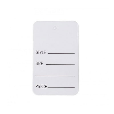 Nahanco Small white coupon price tags, 1 ¼” x 1 7/8”. Unstrung, vertical all-purpose, non-perforated merchandise tag. Printed in black ink, style, size and price.