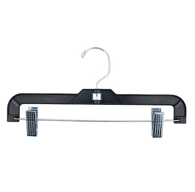 12" Plastic super heavy weight pant hanger comes with metal clips and is black in color.