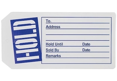 Nahanco Large HOLD merchandise tag, 2 3/8” x 4 3/4”. Bright blue & white background for optimal visibility. 3 Ways to Use: Pre-cut slit through the middle for over-the-hanger hanging, Button slot tag application - Easily slip over a button to hold the tag in place, or Apply with a standard or fine tagging gun (J11S, J11F). Great for retail, resale, dry cleaners, etc. Printed one side, great quality. Pack of 1000.