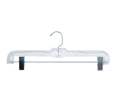 Nahanco 14" Hanger with chrome hook in clear color is made of durable plastic. Hanger is able to support heavier garments and perfect to hang skirt/slacks.
