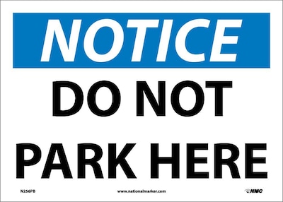 National Marker "Notice Do Not Park Here" Safety sign measuring 10" x 14" is made of adhesive vinyl material for durability.
