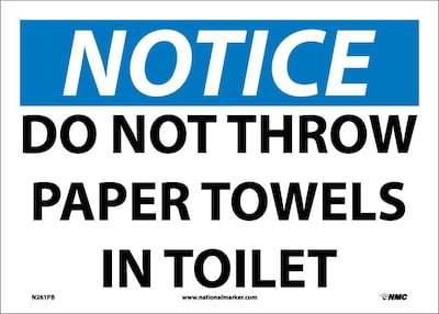 National Marker "Notice Do Not Throw Paper Towels In Toilet" Safety sign measuring 10" x 14" is made of adhesive vinyl material for durability.