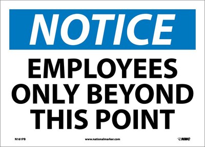 National Marker "Notice Employees Only Beyond This Point" Safety sign measuring 10" x 14" is made of adhesive vinyl material for durability.