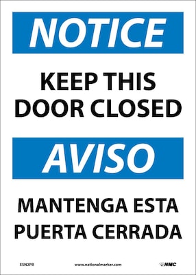 National Marker "Notice Keep This Door Closed" Bilingual safety sign measuring 14" x 10" is made of adhesive vinyl material for durability.