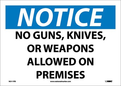 National Marker "Notice No Guns Knives Or Weapons Allowed On Premises" Sign measures 10" X 14" and is made from adhesive vinyl for durability.