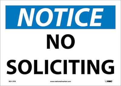 National Marker "Notice No Soliciting" Safety sign measuring 10" x 14" is made of adhesive vinyl material for durability.