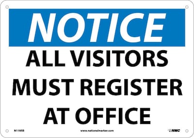 National Marker "Notice All Visitors Must Register At Office" Safety sign measuring 10" x 14" is made of rigid plastic material for durability.