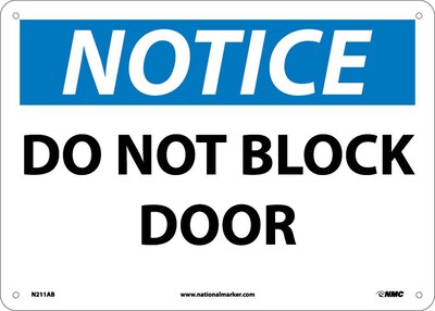 National Marker "Notice Do Not Block Door" Safety sign measuring 10" x 14" is made of 0.040" aluminum material for durability.