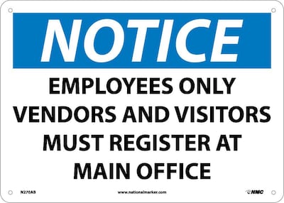 National Marker "Notice Employees Only Vendors And Visitors Must Register At Main Office" Safety sign measuring 10" x 14" is made of 0.040" aluminum material for durability.