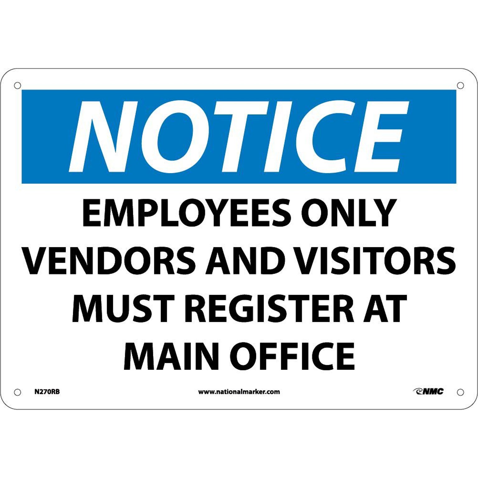 National Marker "Notice Employees Only Vendors And Visitors Must Register At Main Office" Safety sign measuring 10" x 14" is made of rigid plastic material for durability.