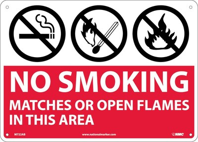 National Marker " No Smoking Matches Or Open Flames In This Area" Safety sign with graphic measures 10" x 14" and is made aluminum material for added durability.