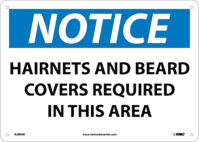 National Marker "Notice Hairnets And Beard Covers Required In This Area" Safety sign measuring 10" x 14" is made of rigid plastic material for durability.
