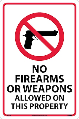 National Marker "No Firearms Or Weapons Allowed On This Property" Safety sign measures 18" x 12" and is made rigid plastic material for added durability.