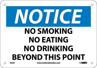 National Marker "Notice No Smoking No Eating No Drinking Beyond This Point" Safety sign measuring 7" x 10" is made of rigid plastic material for durability.