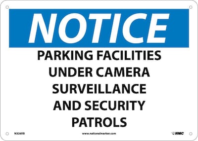 National Marker "Notice Parking Facilities Under Camera Surveillance And Security Patrols" Safety sign measuring 10" x 14" is made of rigid plastic material for durability.