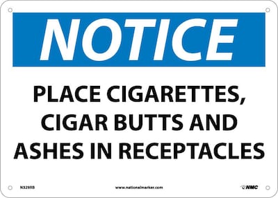Notice Signs; Place Cigarettes, Cigar Butts And Ashes In Receptacles, 10X14, Rigid Plastic