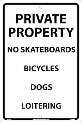 National Marker "Private Property No Skateboards Bicycles Dogs Loitering" Safety sign measures 18" x 12" and is made rigid plastic material for added durability.