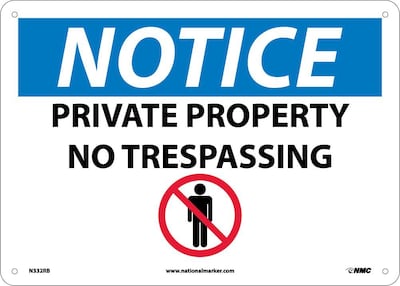 National Marker "Notice Private Property No Trespassing" Safety sign with graphic measures 10" x 14" and is made of rigid plastic material for durability.