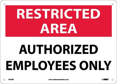 National Marker "Restricted Area Authorized Employees Only" Safety sign measures 10" x 14" and is made rigid plastic material for added durability.