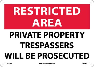 National Marker "Restricted Area Private Property Trespassers Will Be Prosecuted" Safety sign measures 10" x 14" and is made rigid plastic material for added durability.
